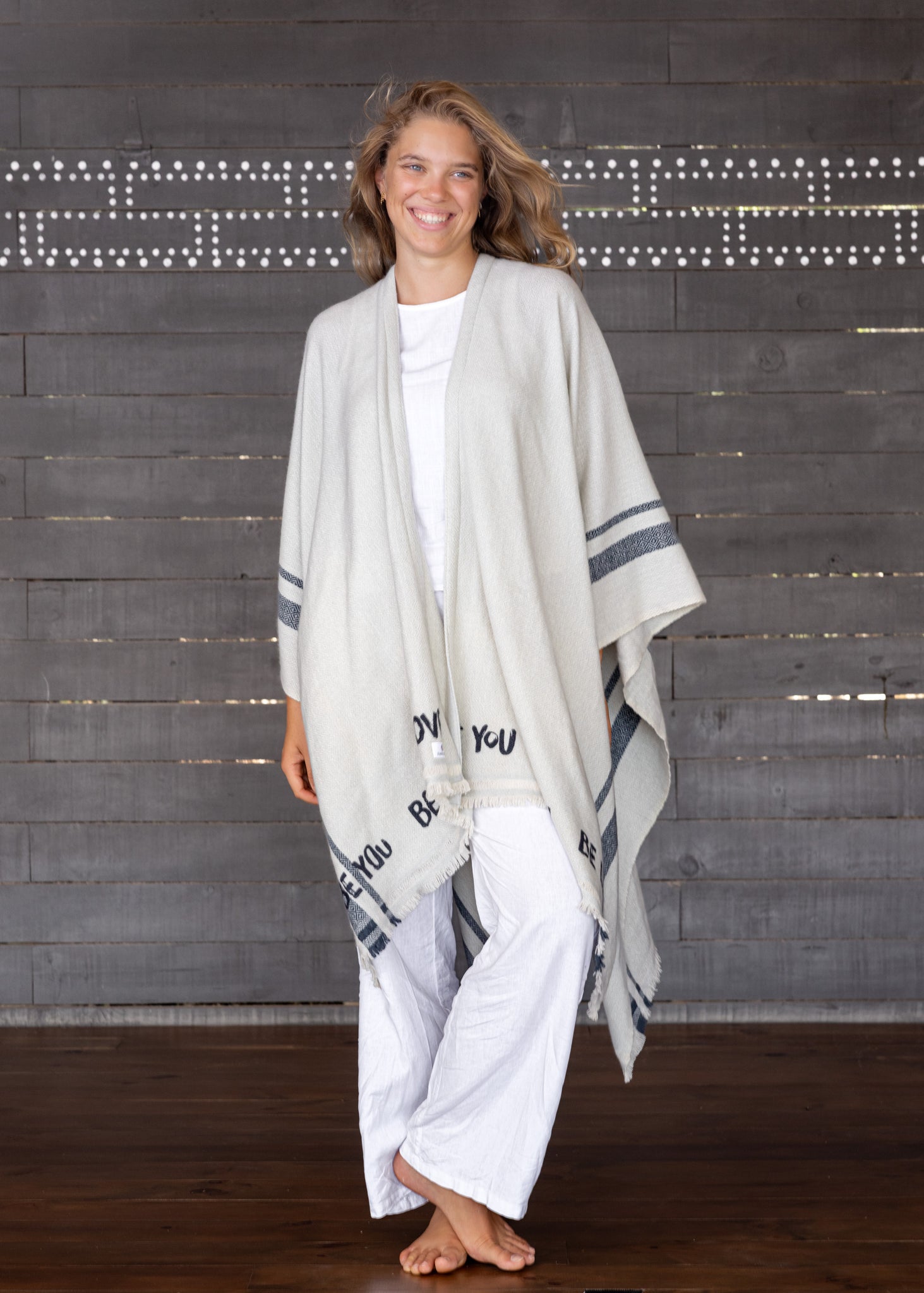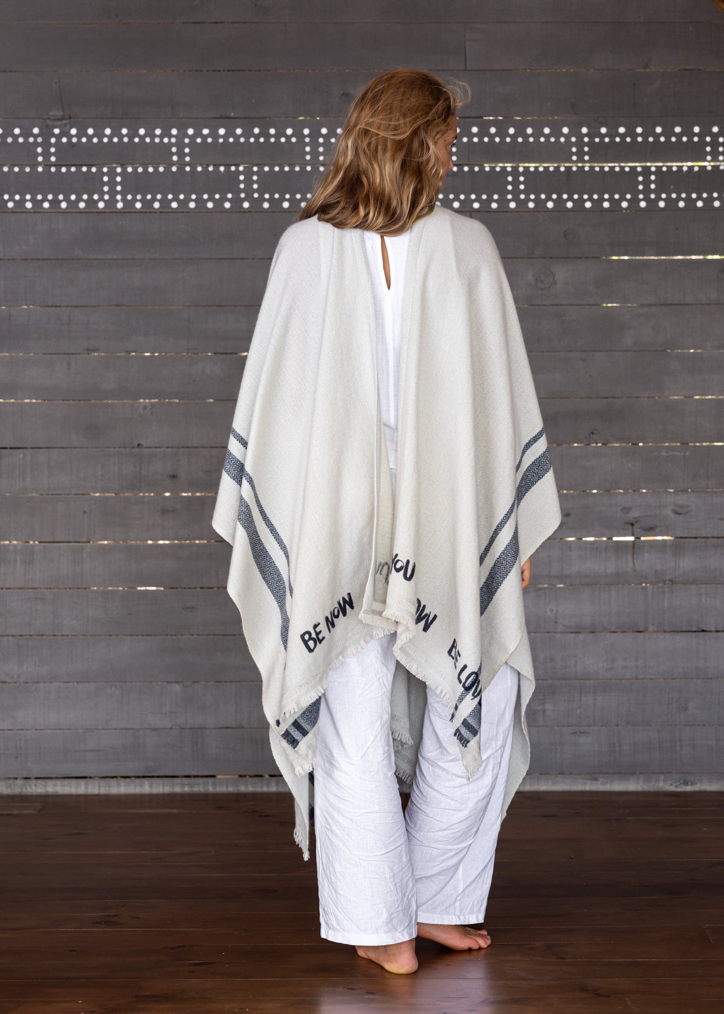 The BE YOU, BE NOW, BE LOVE Poncho is more than a garment – it is a gentle reminder to embrace yourself with love in the present moment.