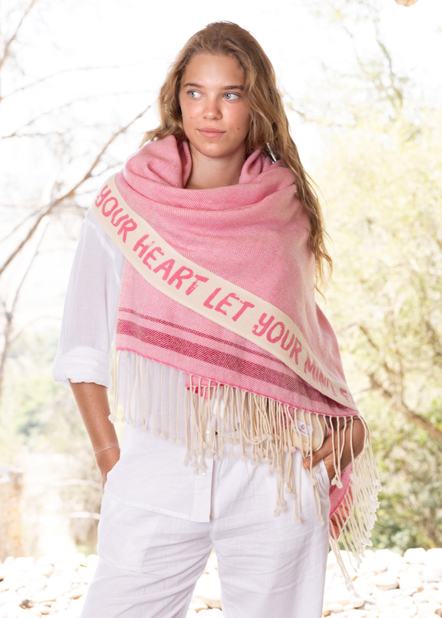 Woven from the finest 26/2 cashmere for extra warmth and a beautifully full handfeel, this piece unites structure and softness. Along its edge runs a separate cashmere border band, delicately woven with the words: “Let your mind fall in love with your heart” – a gentle reminder to listen not just with your mind, but with your heart.